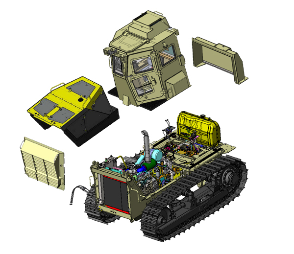 Рис. 2. Базовое шасси трактора Т10М2С/Т12С (серийное) и элементы специальной защиты (защита радиаторов, капот, кабина, защита топливного бака).