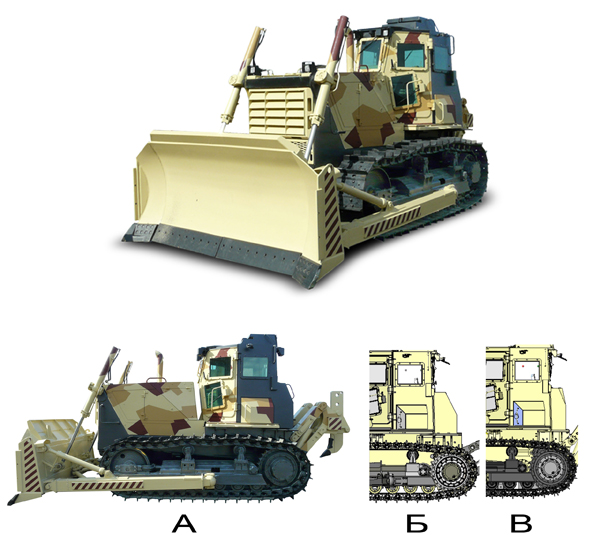 Минимальная переделка базового трактора (меняется колпак кабины, капот, устанавливается дополнительная защита на ряд узлов, усиливается подвеска (амортизаторы) кабины). Возможна установка спецкомплекта защиты на базовый трактор в местах эксплуатации. Единый спецкомплект защиты для тракторов типа Т10 и Т12.